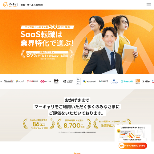 - 満足度は97%で初めて転職する方にもおすすめ!Saas業界のスペシャリストが徹底サポート